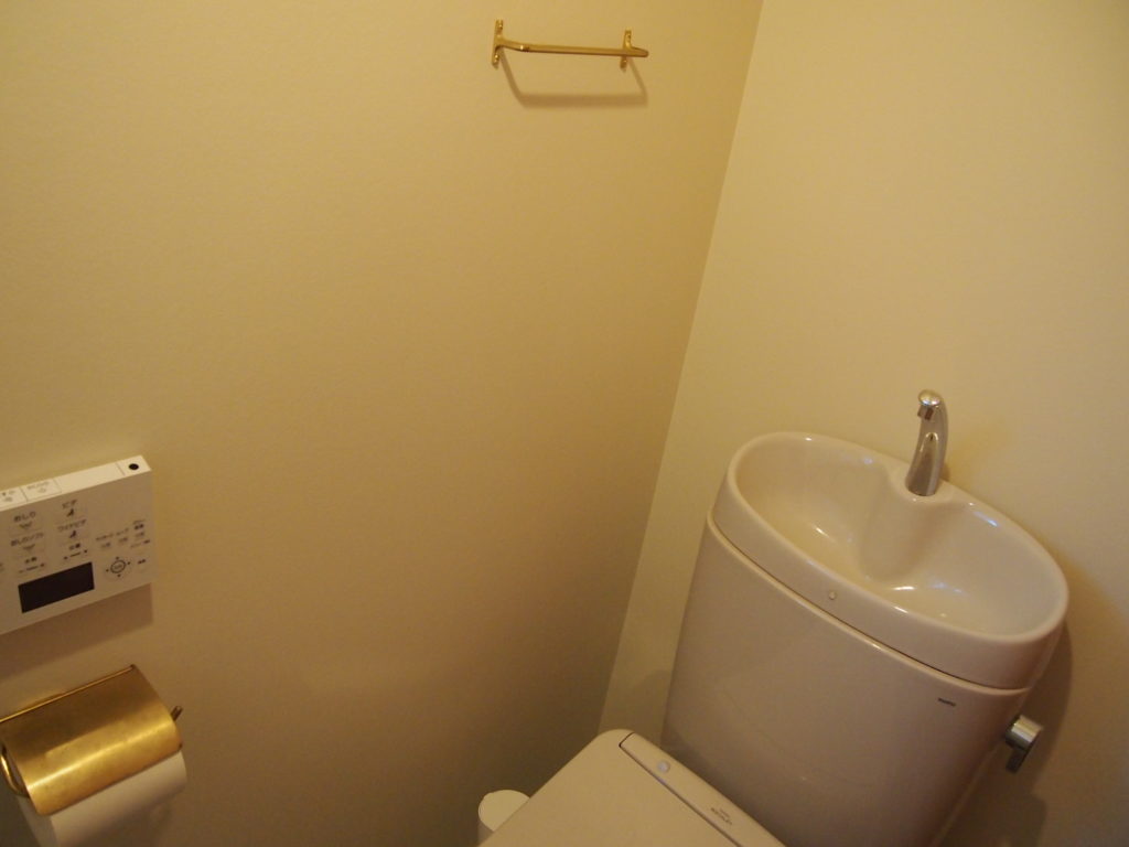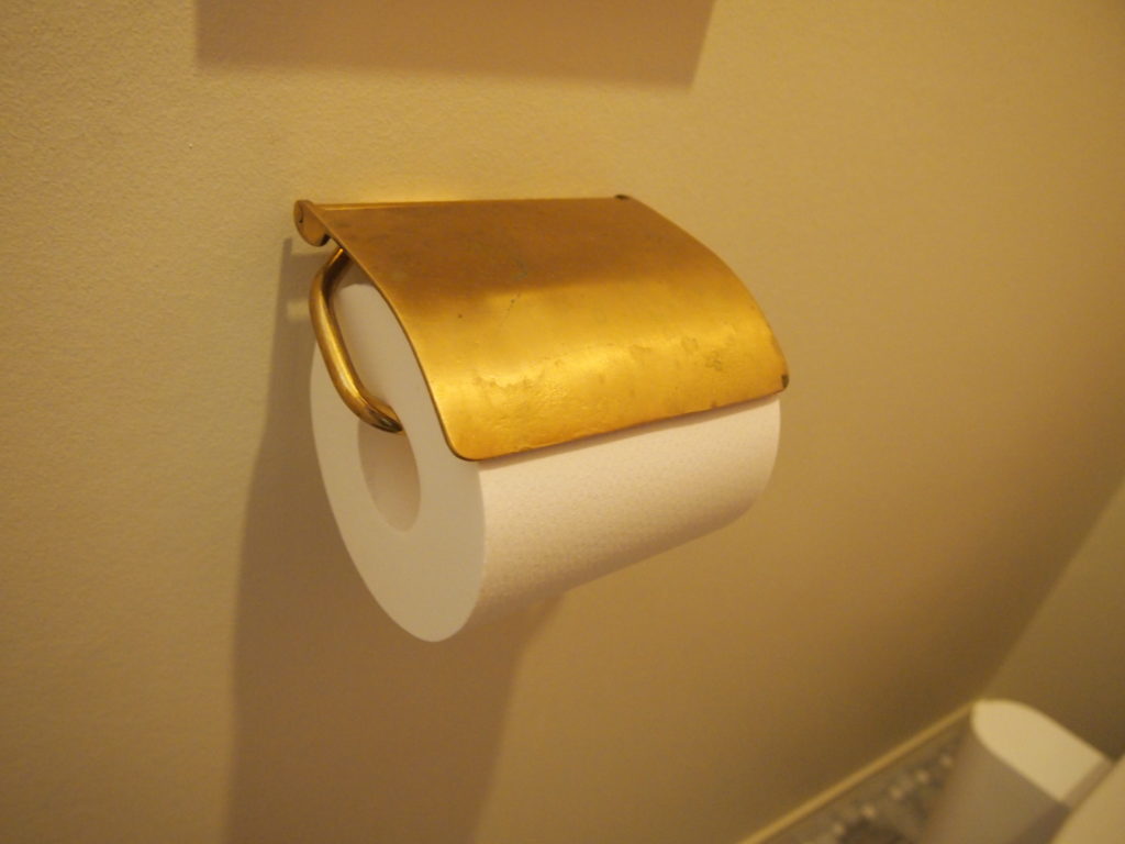 トイレのタオル掛けやペーパーホルダーも、同じく真鍮で統一。