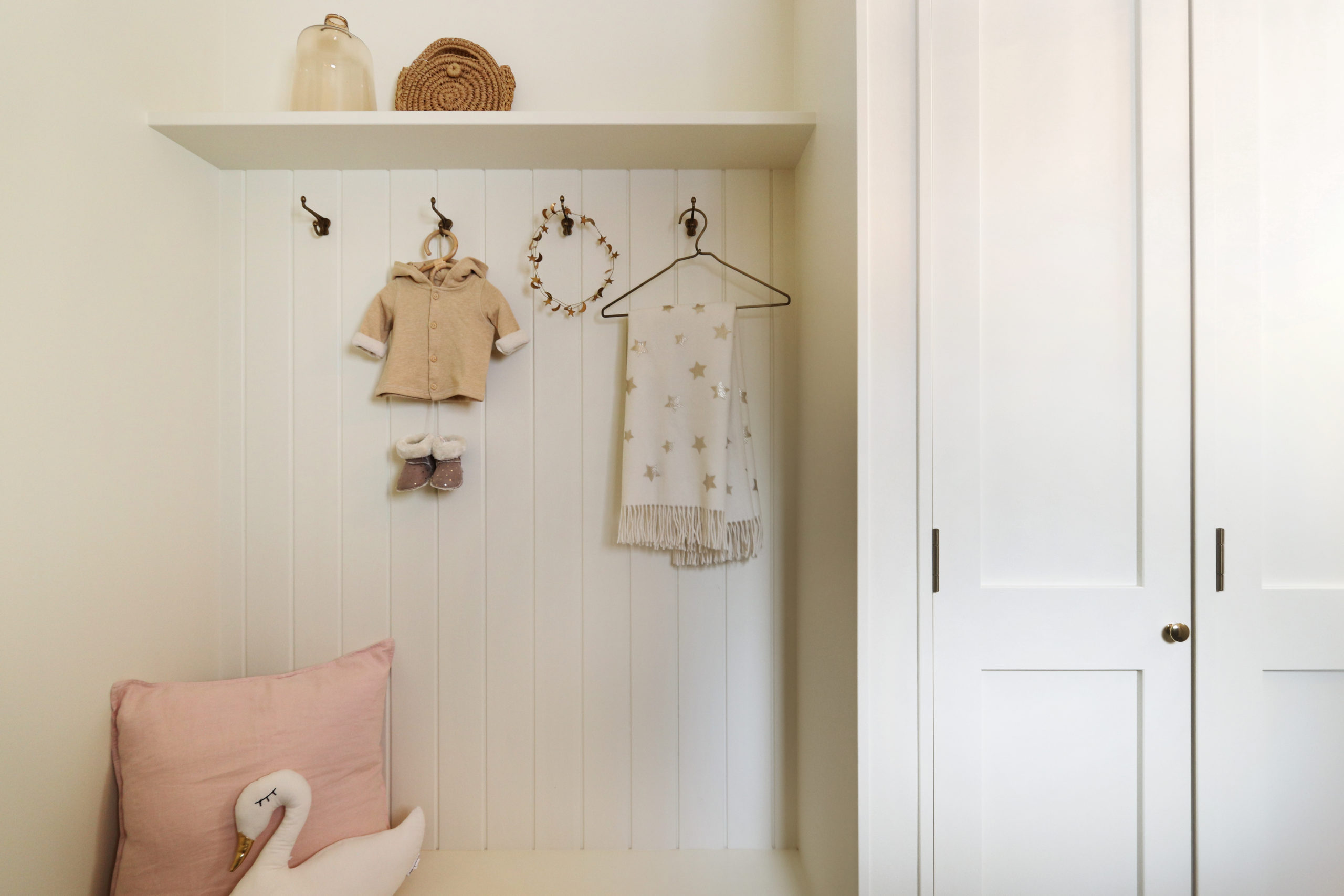 白を基調とした玄関の雰囲気に、コートフックの感じが丁度いい。