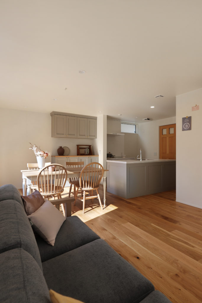全体像。リビングから、ダイニングキッチンの方を向いたところ。